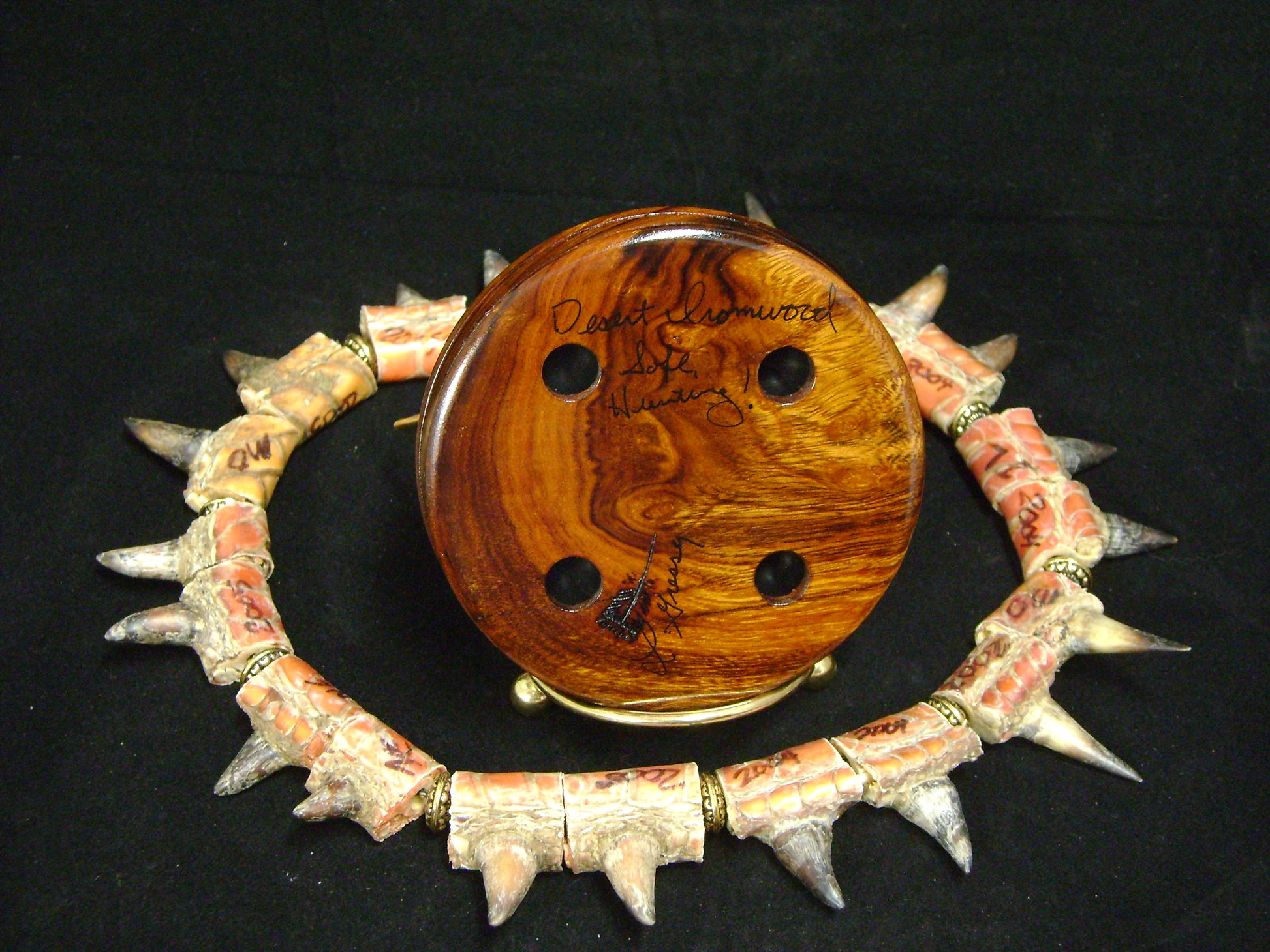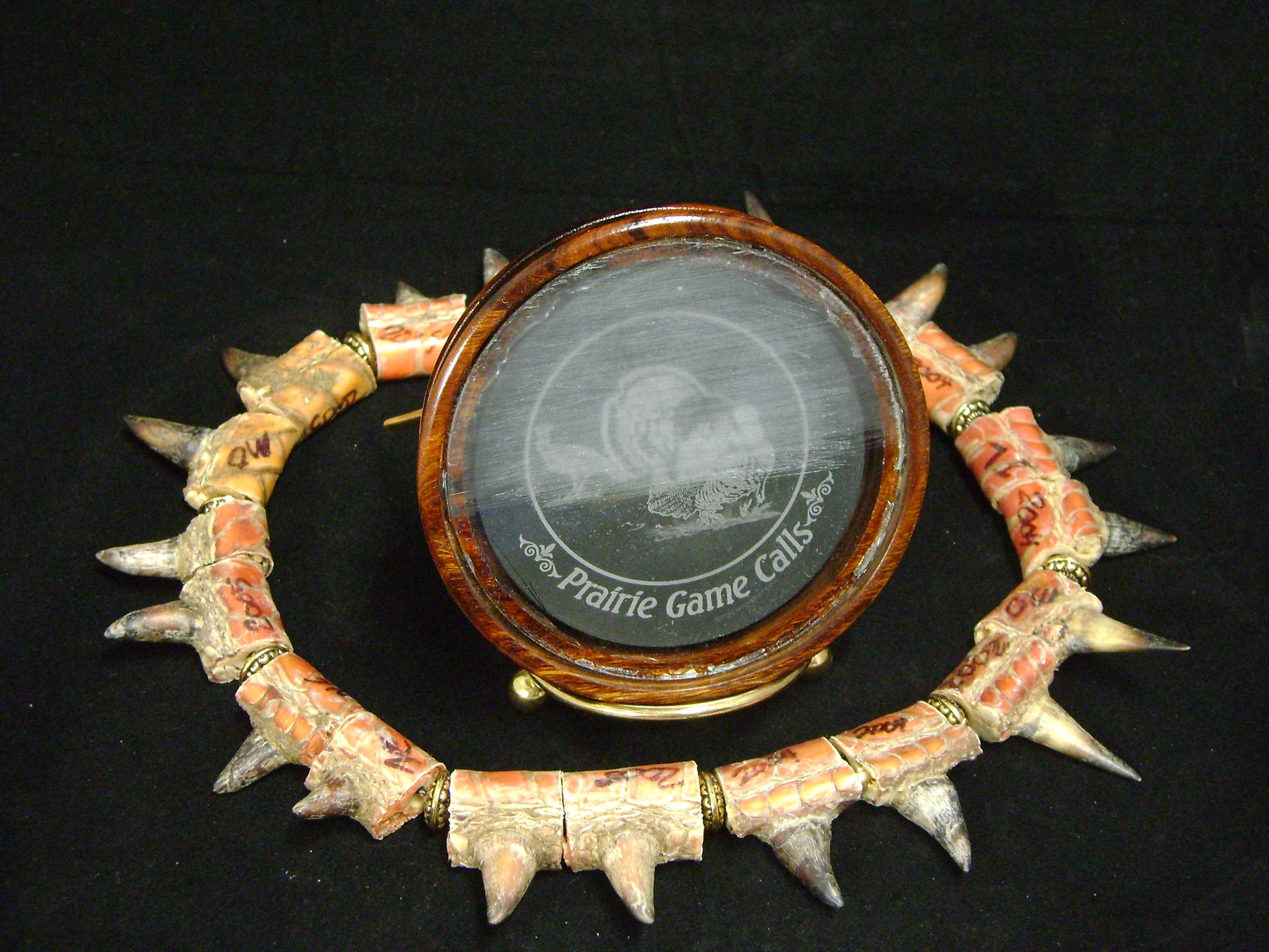 3.5" Glass playing surface over a laser engraved black anodized aluminum sound board in a Highly Figured Desert Ironwood pot gives an outstanding roll over sound in all the areas of the call. Glass over Aluminum gives the response you are looking for in a call but has a distinct ring to the notes due to the aluminum sound board. Nice raspy tones are heard throughout the call. The sharp response from the aluminum sound board makes this call a good choice when looking for a call that will perform well in open country or on those windy days. Rio's and Merriams love the sound of this one. I make this call in several different wood species which will give various sound/tone differences. Call bag is included and a handcrafted striker. Great sound when using my aluminum striker also.