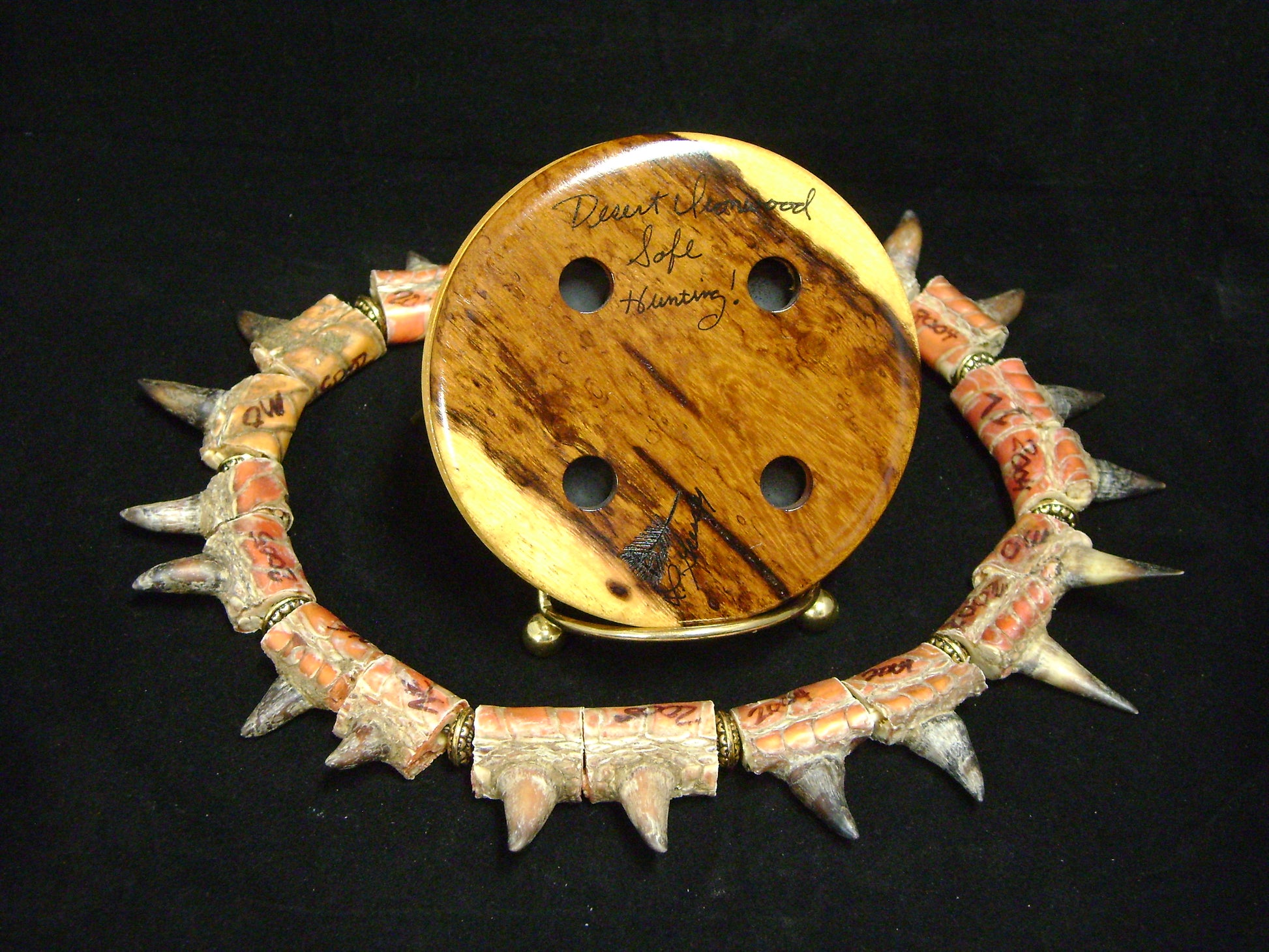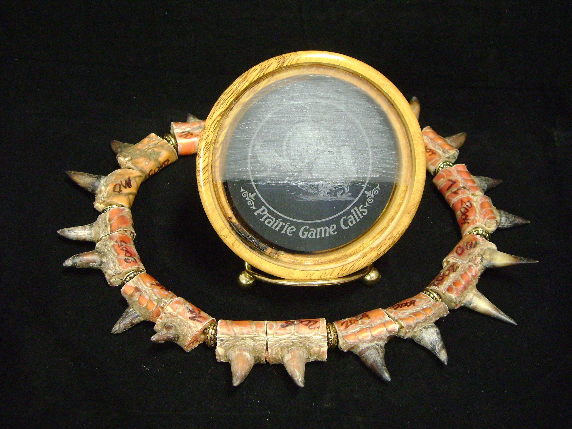3.5" Glass playing surface over a laser engraved black anodized aluminum sound board in a Highly Figured Desert Ironwood pot gives an outstanding roll over sound in all the areas of the call. Glass over Aluminum gives the response you are looking for in a call but has a distinct ring to the notes due to the aluminum sound board. Nice raspy tones are heard throughout the call. The sharp response from the aluminum sound board makes this call a good choice when looking for a call that will perform well in open country or on those windy days. Rio's and Merriams love the sound of this one. I make this call in several different wood species which will give various sound/tone differences. Call bag is included and a handcrafted striker. Great sound when using my aluminum striker also.