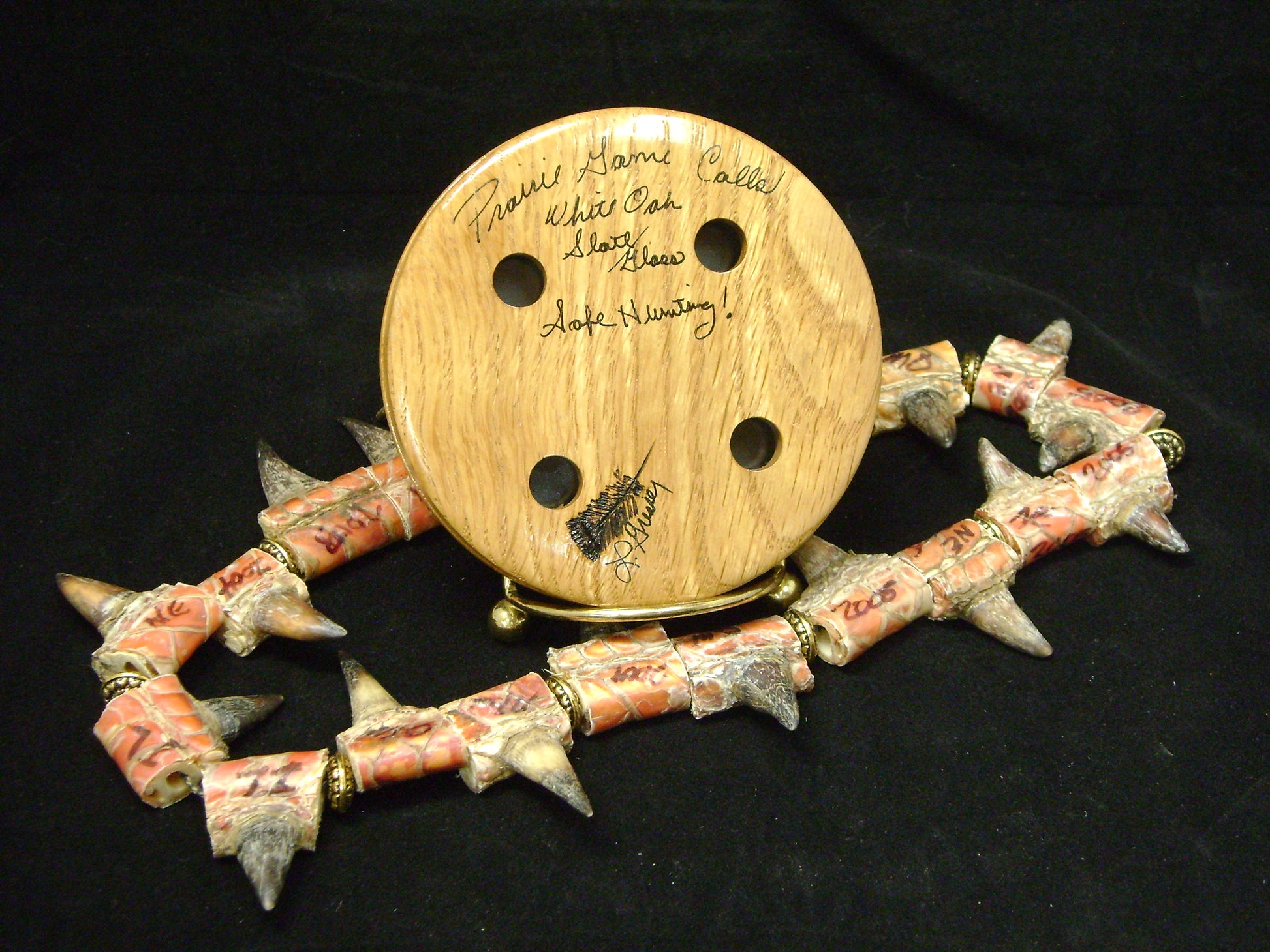 This is a 3.5" Gray color slate surface over a glass sound board in a White Oak pot. Slate calls are the most poplar calls used on spring turkey hunts. Hunters like the mellow tones that this call will produce. Gray slate can be combined over other materials to provide you with many different sounds so you don't sound like everyone else in the woods. The gray slate plays well and makes some great turkey sounds. Nice sharp breaking sounds and raspyness can be added by a changing up of the striker woods. Birds respond well to the sounds this call makes also. Handcrafted striker and call bag are included.