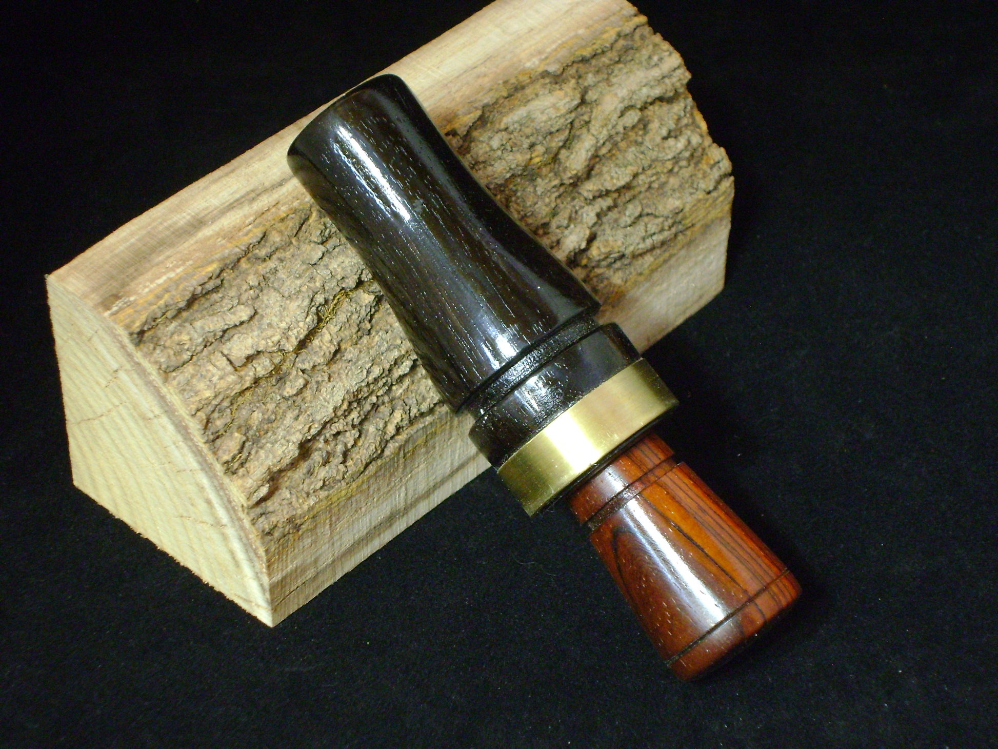 This is a all wood Mallard duck call. Hand cut tone board from my personal J-frame jig. The barrel of this call is made from African Blackwood with a Cocobolo tone board exhaust. Brushed brass band on the barrel of the call. Gloss finished wood. Call has good volume and nice low end rasp. Can be used for timber call or open water and will carry well. Easy to blow 10mm thickness single reed. Call bag included.