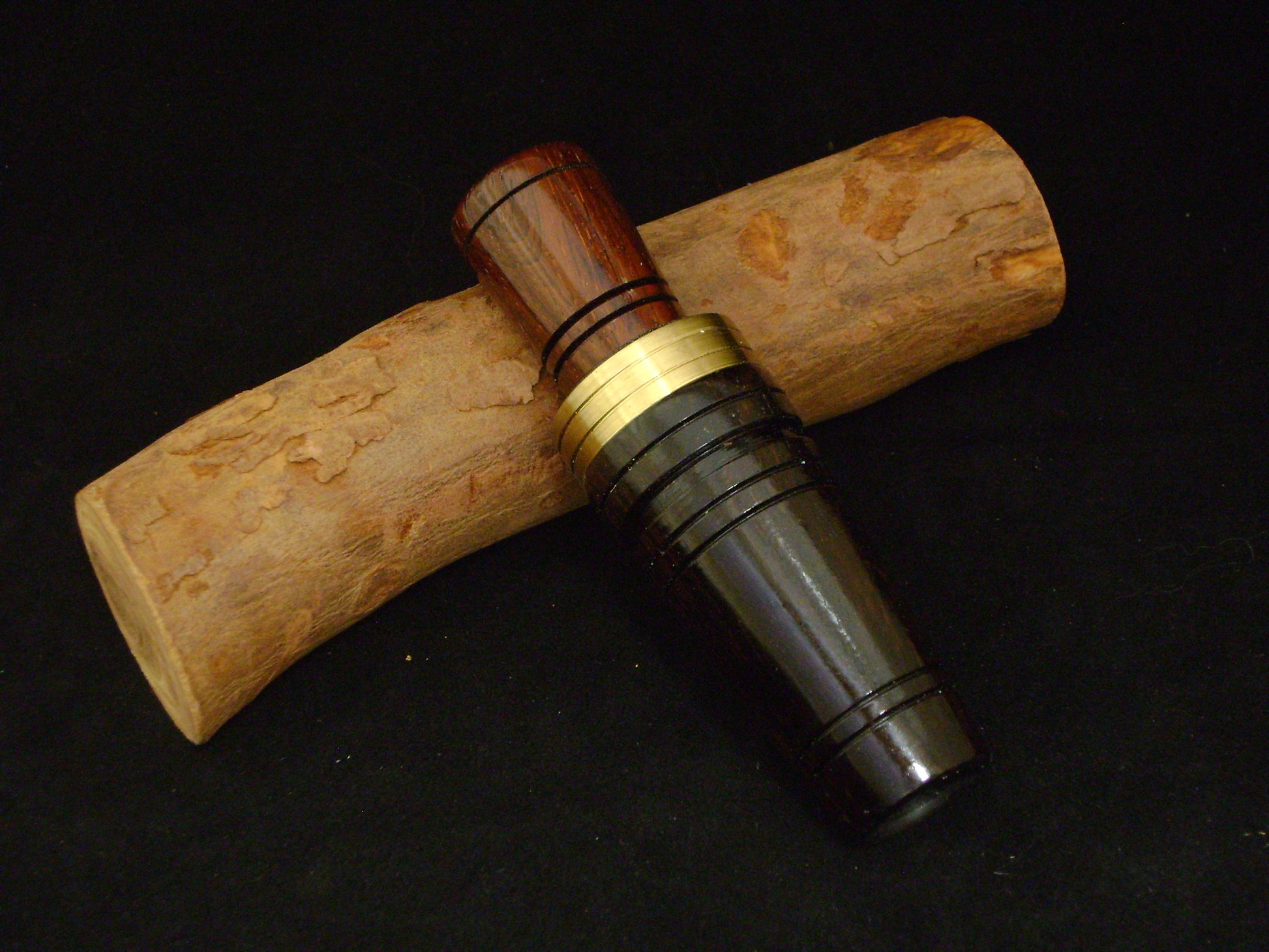 This is a all wood Mallard duck call. Hand cut tone board from my personal J-frame jig. The barrel of this call is made from African Blackwood and a Mexican Cocobolo tone board and exhaust. Brushed Brass band on the barrel of the call. Call has good volume and nice low end rasp. Can be used for timber call or open water and will carry well. Easy to blow 10mm thickness single reed. Call bag included.