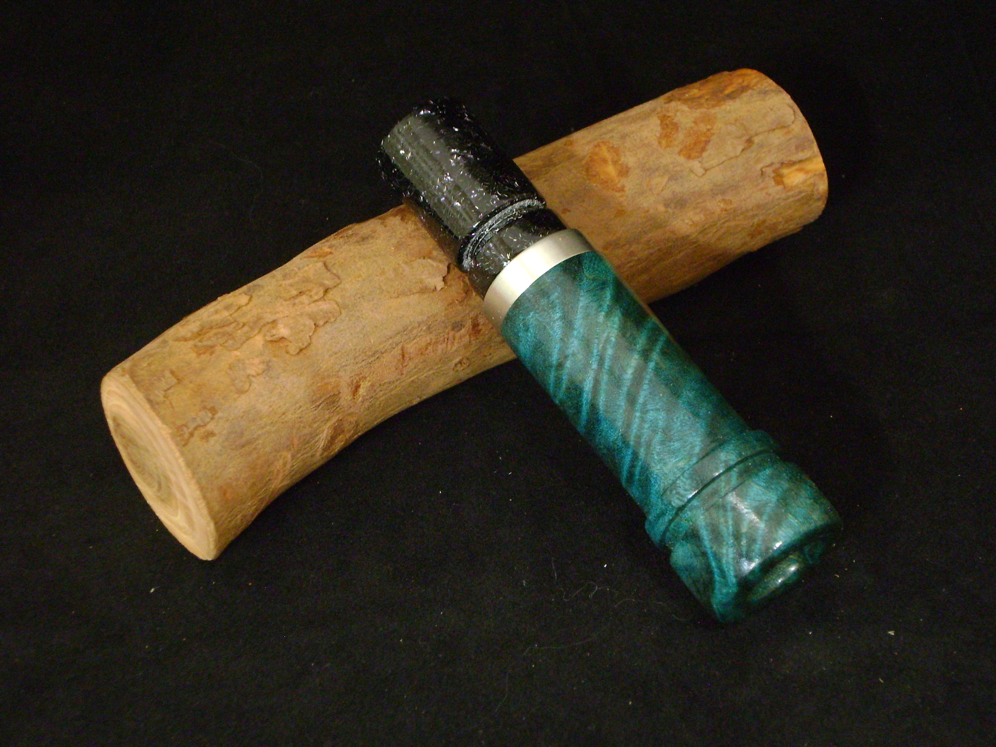 This is a all hybrid Stabilized wood and acrylic Mallard duck call. Hand cut tone board from my personal J-frame jig. The barrel of this call is made from Stabilized Maple Burl dyed blue with a Black Bass Boat acrylic exhaust and tone board. Brushed Aluminum band on the barrel of the call. This call was turned in likeness of a D-2 Olt style call. Call has good volume and nice low end rasp. Can be used for timber call or open water and will carry well. Easy to blow 10mm thickness single reed. Call bag included.