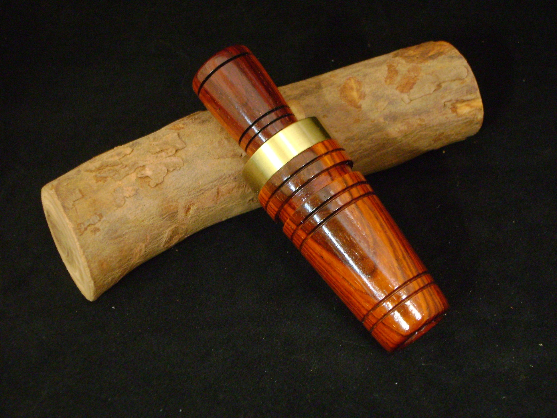 This is a all wood Mallard duck call. Hand cut tone board from my personal J-frame jig. The barrel of this call is made from Mexican Cocobolo wood with a Mexican Cocobolo tone board and exhaust. Brushed Brass band on the barrel of the call. Call has good volume and nice low end rasp. Can be used for timber call or open water and will carry well. Easy to blow 10mm thickness single reed. Call bag included. (C#2)