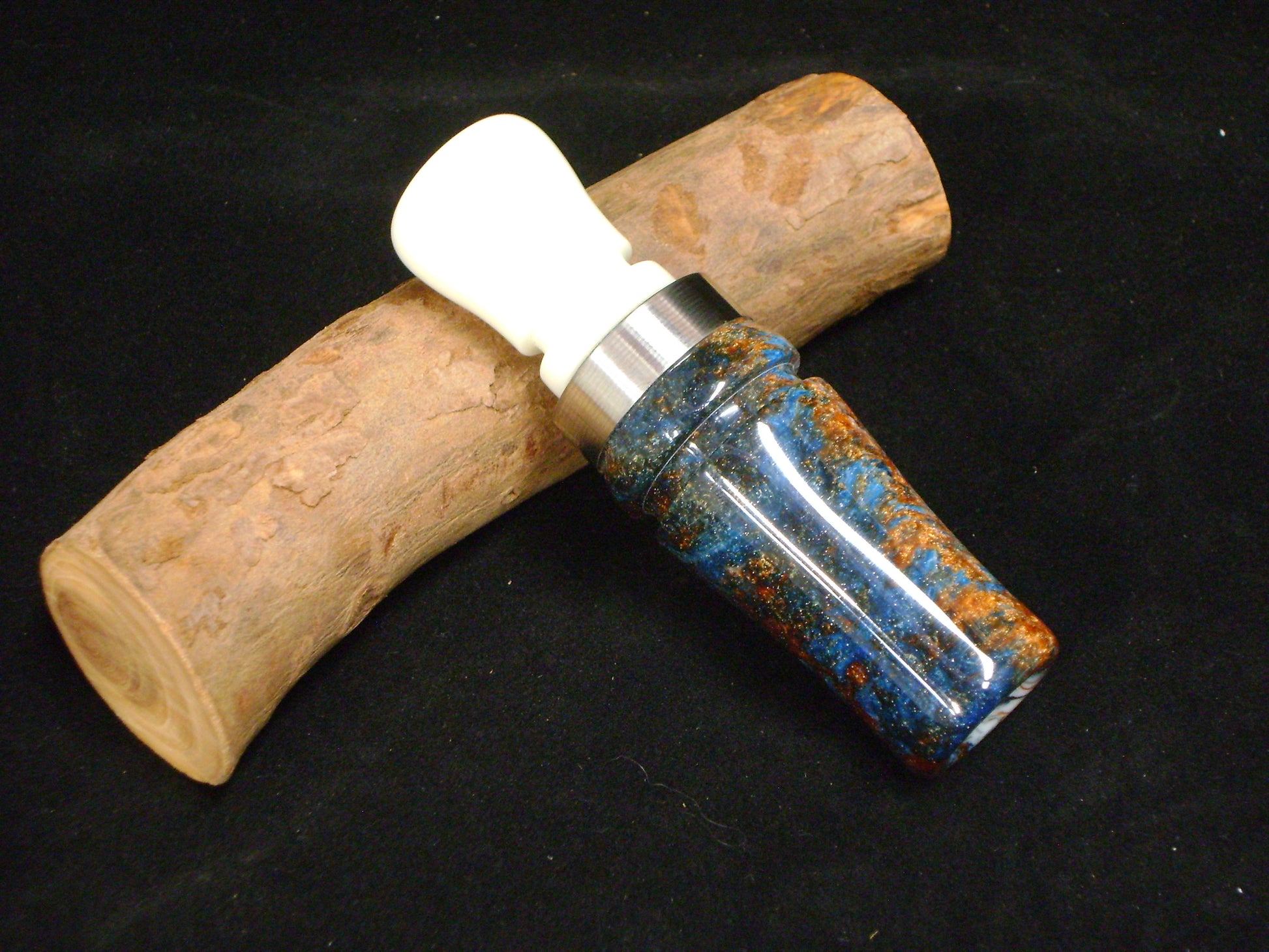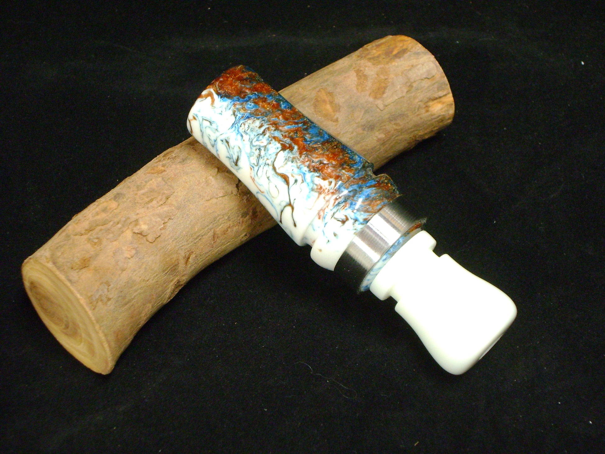 This is a all acrylic Mallard duck call. Hand cut tone board from my personal J-frame jig. The barrel of this call is made from Copper Creek acrylester with White acrylic for the tone board and exhaust. Polished SST band on the barrel of the call. Call has good volume and nice low end rasp. Can be used for timber call or open water and will carry well. Easy to blow 10mm thickness single reed. Call bag included.