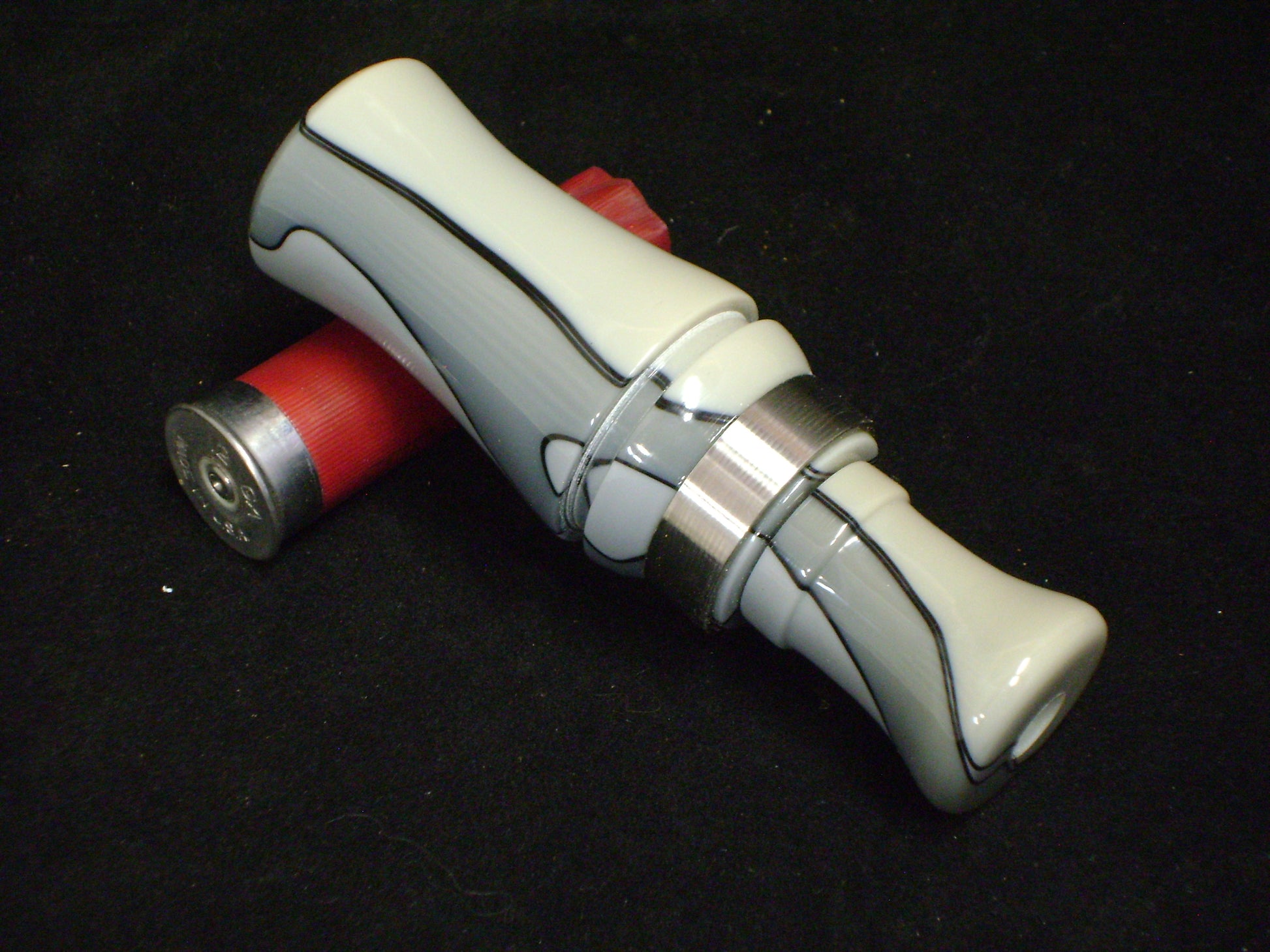 This is a all acrylic Mallard duck call. Hand cut tone board from my personal J-frame jig. The barrel of this call is made from Gray Camo Acrylic Rod with a Gray Camo exhaust and tone board. Polished SST band on the barrel of the call. Call has good volume and nice low end rasp. Can be used for timber call or open water and will carry well. Easy to blow 10mm thickness single reed. Call bag included