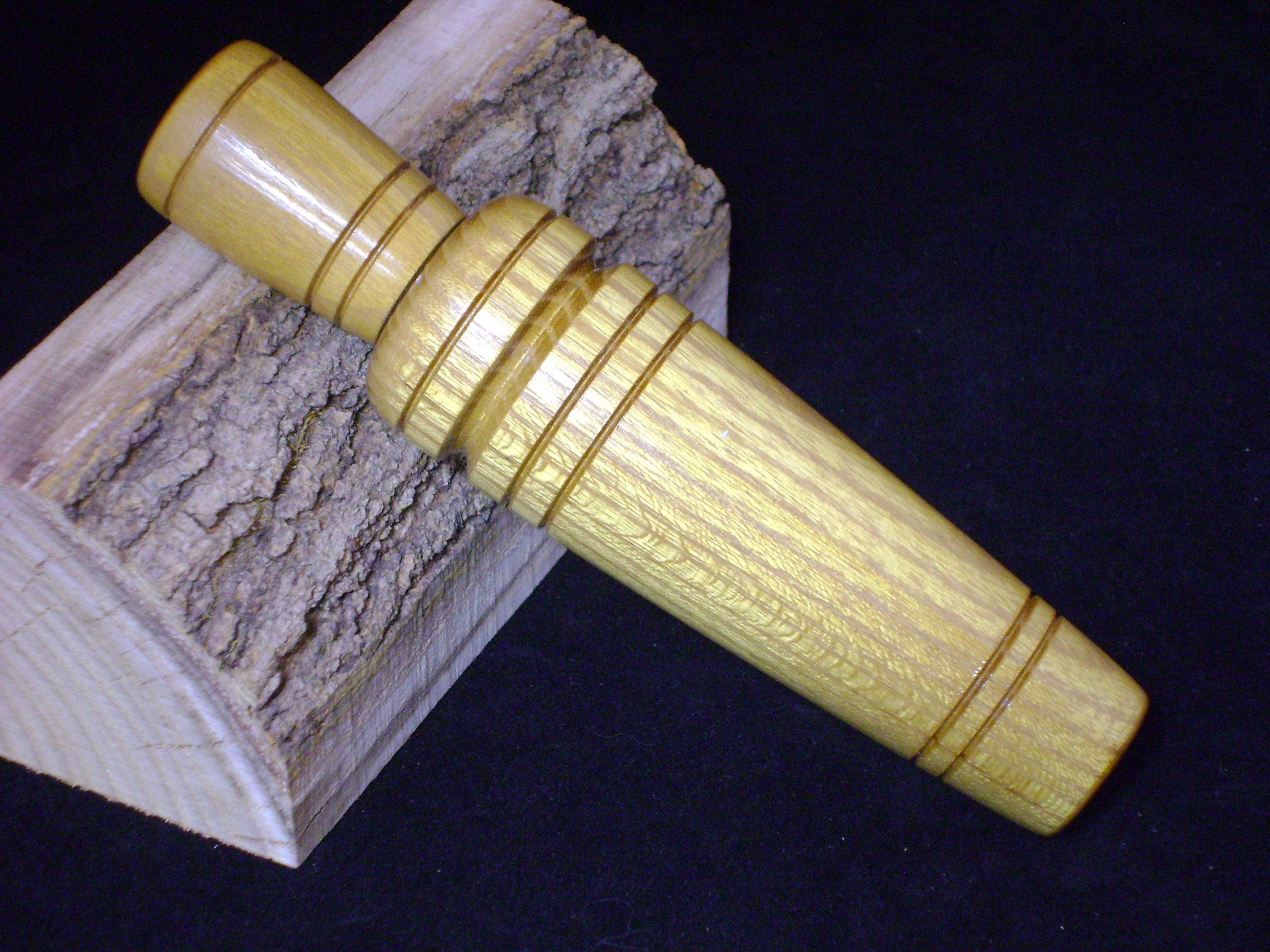 This is a all wooden "Old Styled" mallard duck call. Made from high figured Osage Orange wood with a Osage Orange insert. Designed similar in shape to the old time favorites from the 1940's and 50's. This style of call was even carried into the 1960's as well. The overall length of the call is about 5 3/4" long. The insert has a o-ring style insert which is a Arkansas cut tone board. Each insert is hand cut from my personal J-frame tone board jig. Due to the length of the call this style requires a little bit more air than my shorter Arkansas style calls. I have chosen high figure woods for their looks and durability for this style of call. Call B.