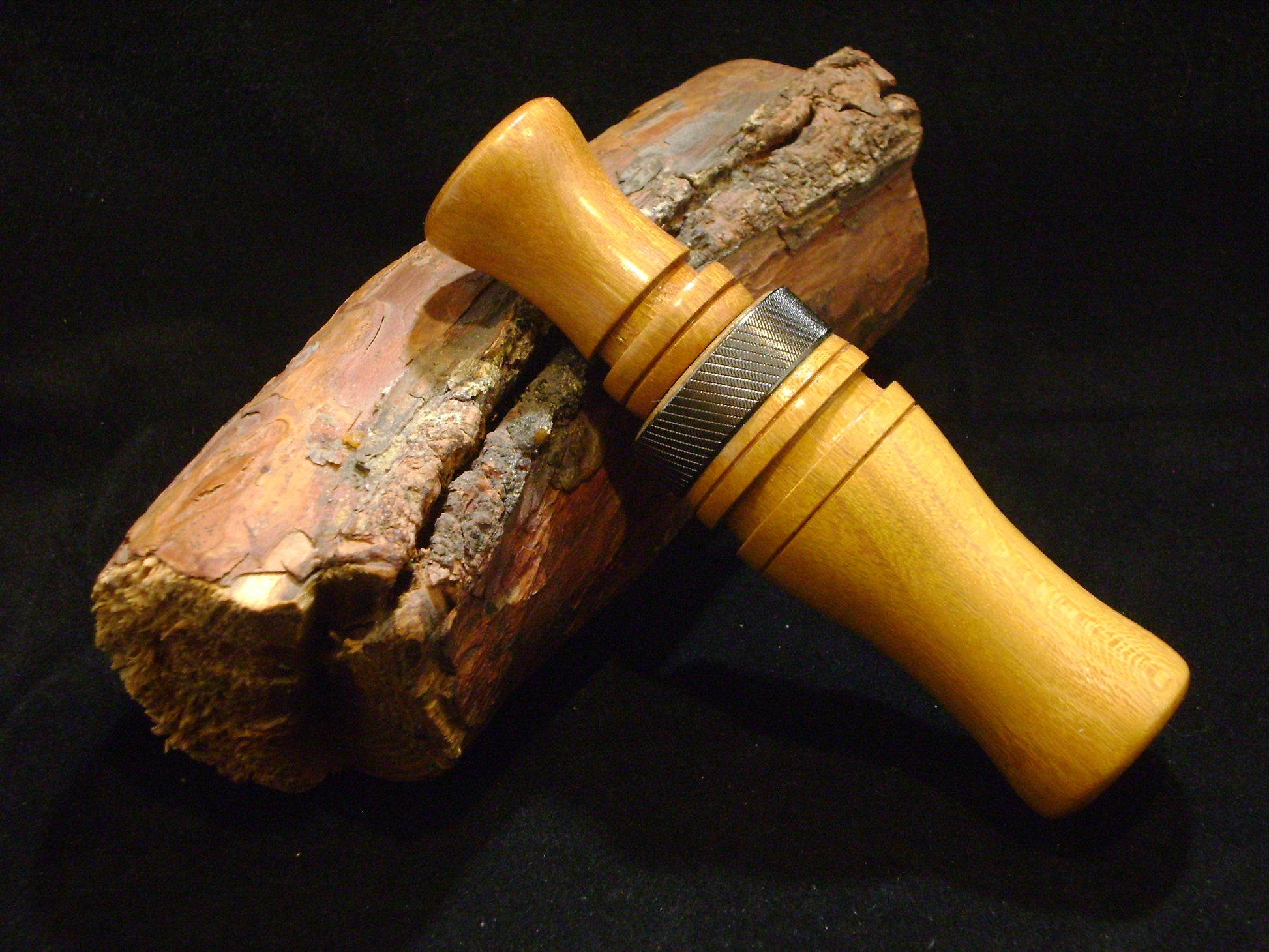 This is a all wood Mallard duck call. Hand cut tone board from my personal J-frame jig. The barrel of this call is made from Osage Orange wood with a Osage Orange exhaust and tone board. Knurled Bronze band on the barrel of the call. Call has good volume and nice low end rasp. Can be used for timber call or open water and will carry well. Easy to blow 10mm thickness single reed. Call bag included.