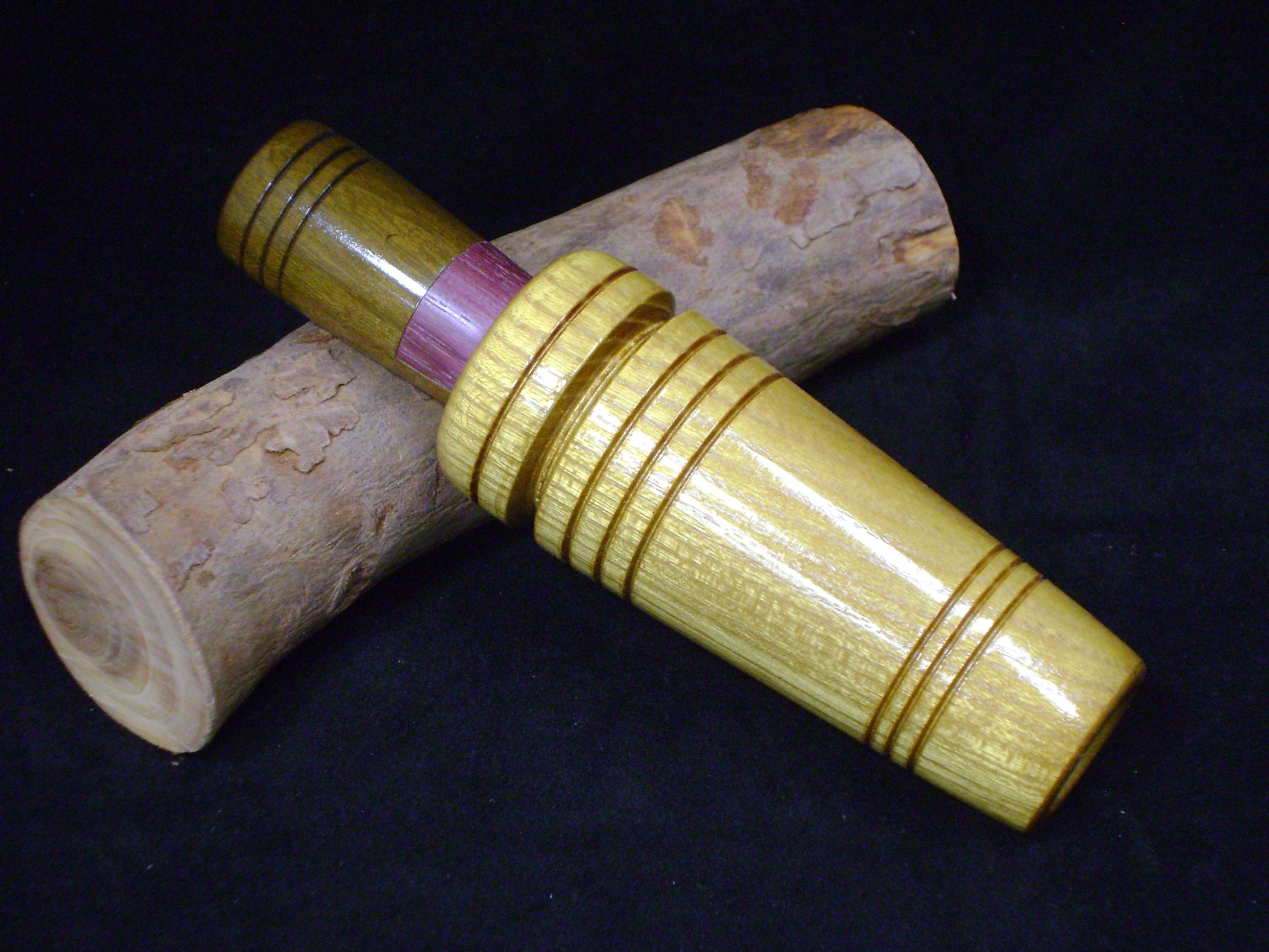 This is a Reelfoot Styled metal reed duck call. This model here is the full size version with the barrel measuring approx. 4" in length and 3/4" bore. The barrel is made of Osage Orange wood. The exhaust is made of Green Osage Orange wood with a Purpleheart wedge. Reed in this call is made of Stainless Steel and has been tuned. Call bag included.