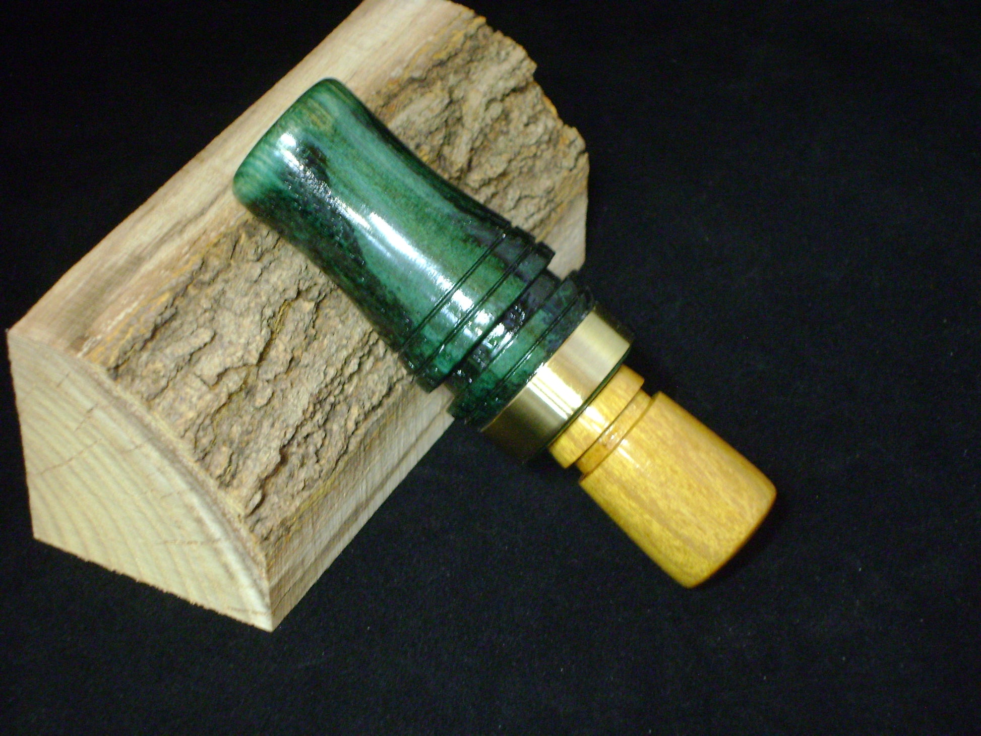 This is a all wood Mallard duck call. Hand cut tone board from my personal J-frame jig. The barrel of this call is made from Stabilized Spaulted Green Dyed Maple wood with a Osage Orange tone board exhaust. Polished brass band on the barrel of the call. Call has good volume and nice low end rasp. Can be used for timber call or open water and sound will carry well. Easy to blow 10mm thickness single reed. Call bag included.